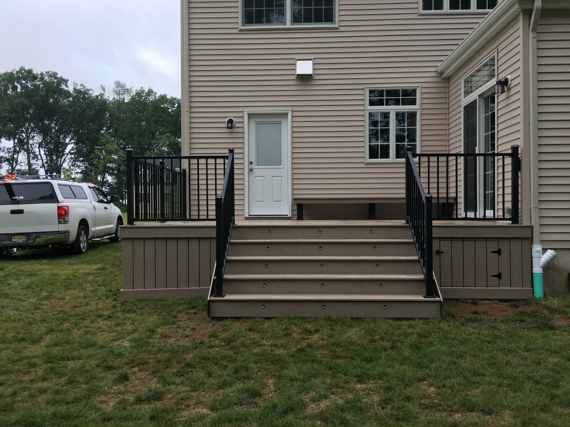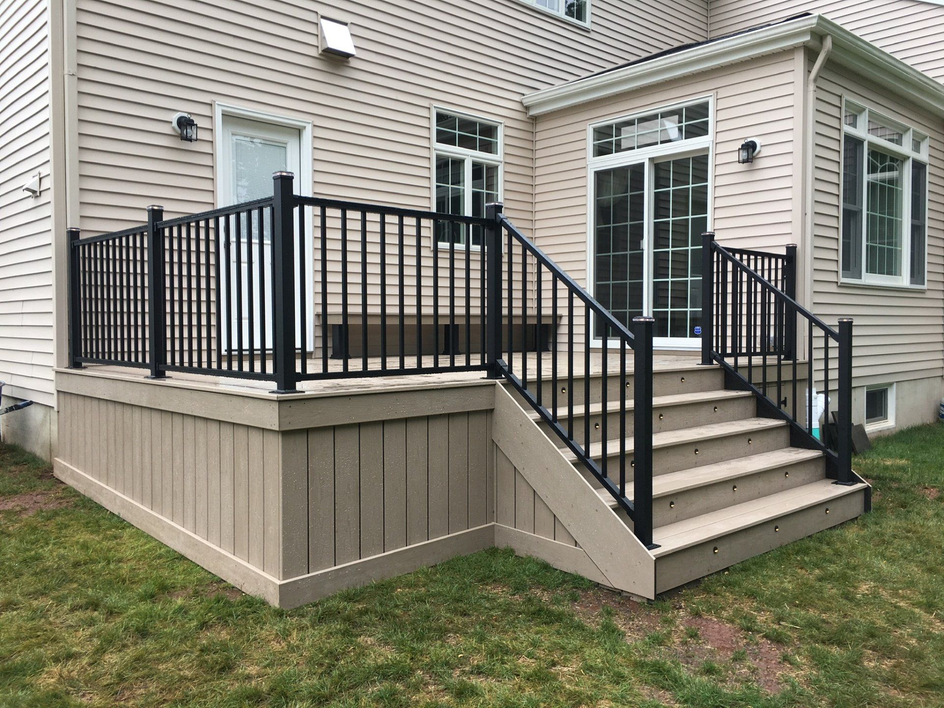 The Deck Express Service offers three sizes decks that come with a pressure treated frame, Trex Enhance Decking and RDI Vinyl Railing with white or aluminum black balusters.